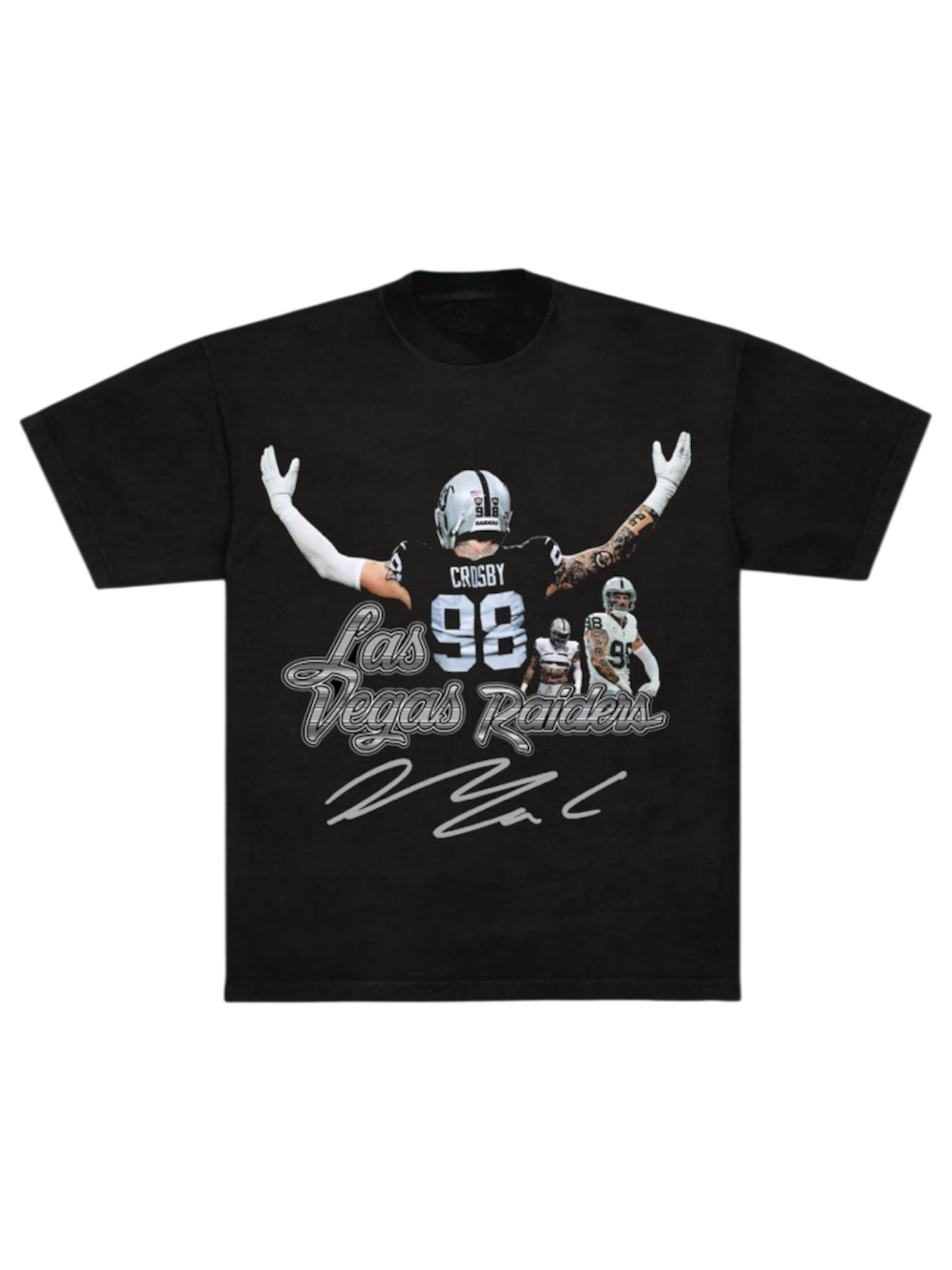 Unleash the chaos with the Mad Maxx Crosby graphic tee—built for fans who thrive on relentless energy and all-out aggression. Featuring the Raiders' defensive beast in full attack mode, this design captures Crosby mid-rush, eyes locked in, draped in silver and black smoke with sparks flying around him. Finished with gritty textures and a streetwear silhouette, this tee is a tribute to intensity, hustle, and pure defensive dominance.