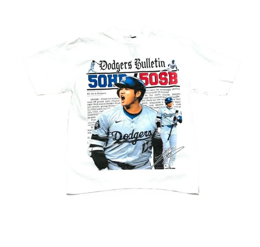 The bold "50/50 Season" headline pays tribute to his record-breaking combination of home runs and stolen bases in a single season, with detailed stats subtly integrated into the artwork. Crafted from ultra-soft, breathable fabric, this tee combines comfort and style, making it a must-have for every baseball fan.