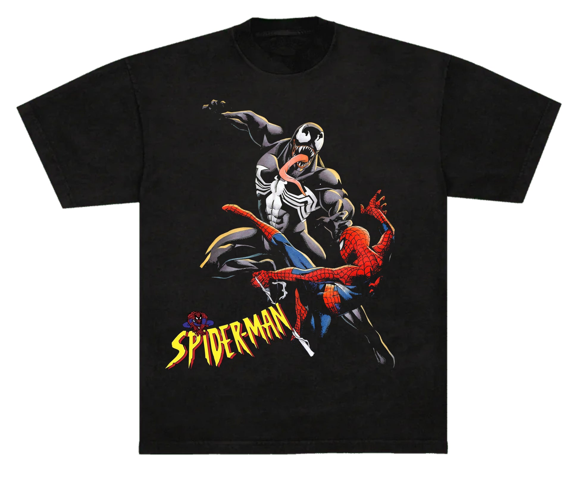 Showcase an epic Marvel showdown with this bold Venom vs. Spider-Man graphic tee. Featuring high-energy artwork of the symbiote and web-slinger locked in battle, the design bursts with inky blacks, deep reds, and electric blues for a gritty comic-book vibe. Printed on a soft, durable tee, it’s perfect for fans who want to carry the ultimate rivalry from the pages of Marvel wherever they go.